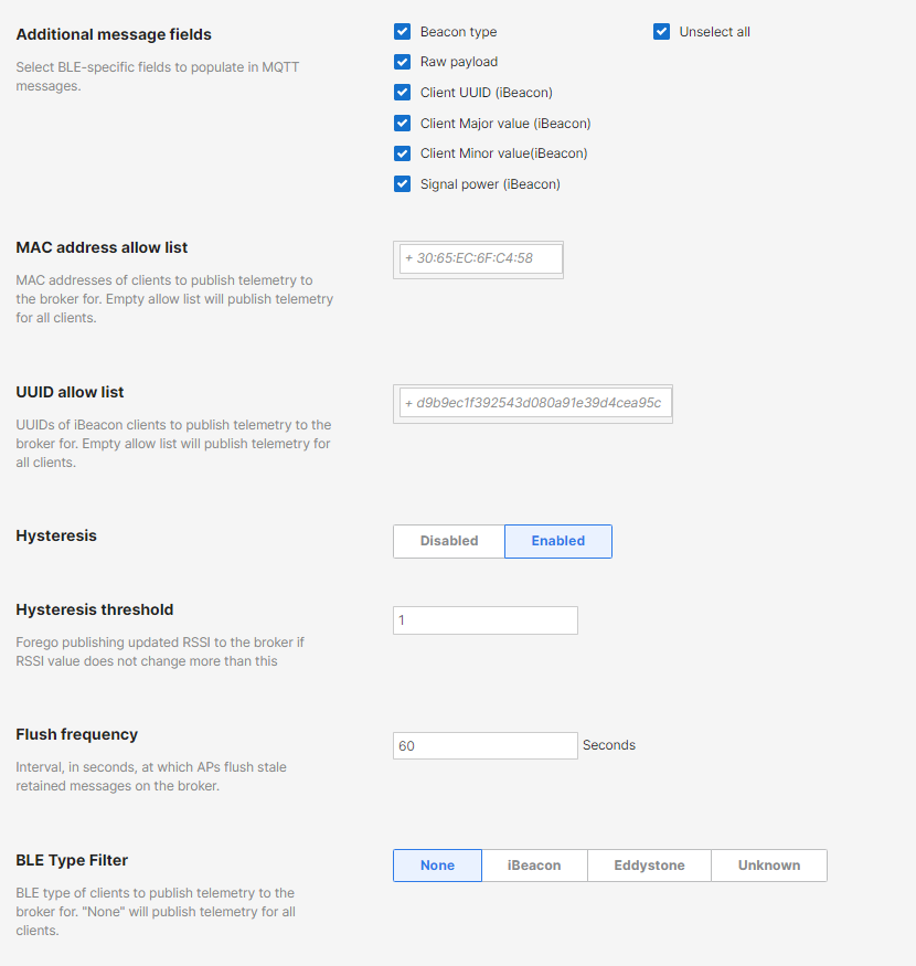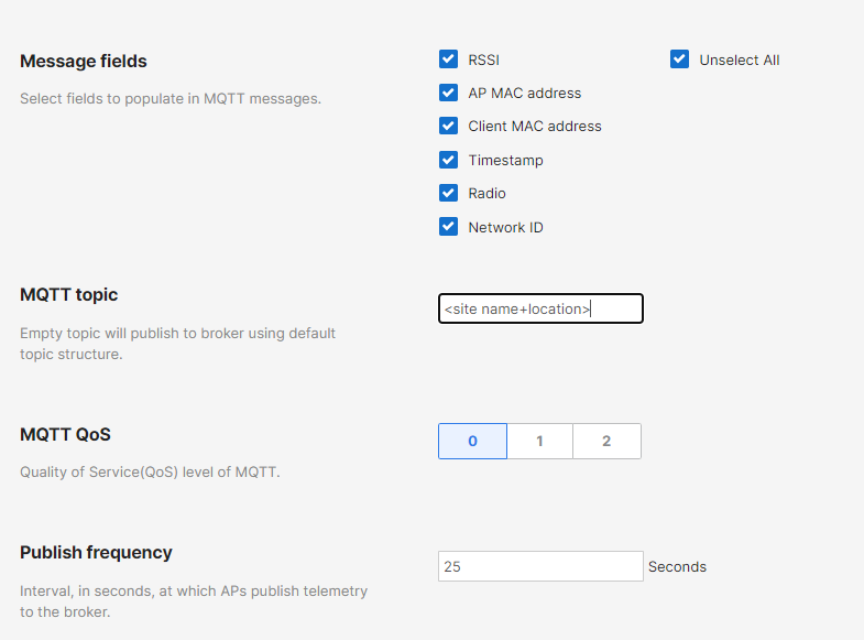 - Ensure the following "Message fields" are selected RSSI, AP Mac Address, Client Mac Address, Timestamp, Radio, Network ID