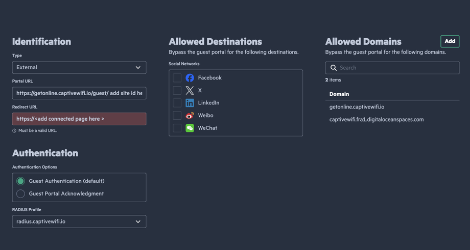 - Portal URL: https://getonline.captivewifi.io/guest/*SiteID* (Locate your specific ID here)